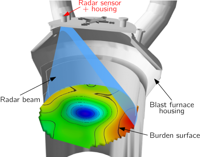 Gauging of the full three-dimensional blast furnace burden surface in real time enables an optimized charging process. Subsequently, lower energy and raw material costs, etc., can be expected. Up to now, only point-wise measurements like tank radar gauges, mechanical depth probes or mechanical surface scanning systems are available. Optical or acoustical measurement techniques are not reliable due to the harsh environmental conditions.