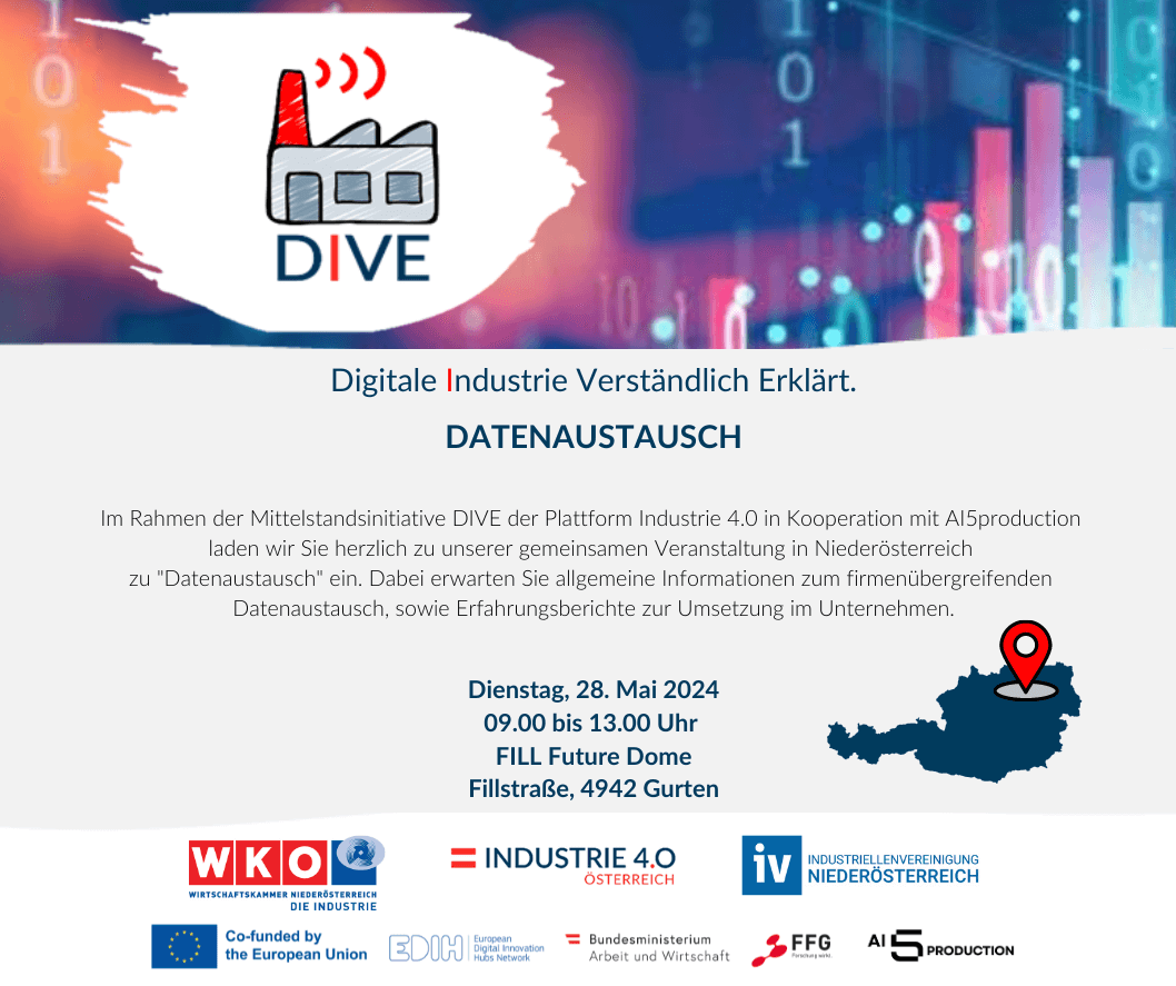 In Kooperation mit der Sparte Industrie der Wirtschaftskammer OÖ und der Industriellenvereinigung Oberösterreich, veranstaltet der European Digital Innovation Hubs „AI5production“ am 28.05.2024 ein Training mit umfangreichen Informationen zum Themenschwerpunkt „Datenaustausch“.