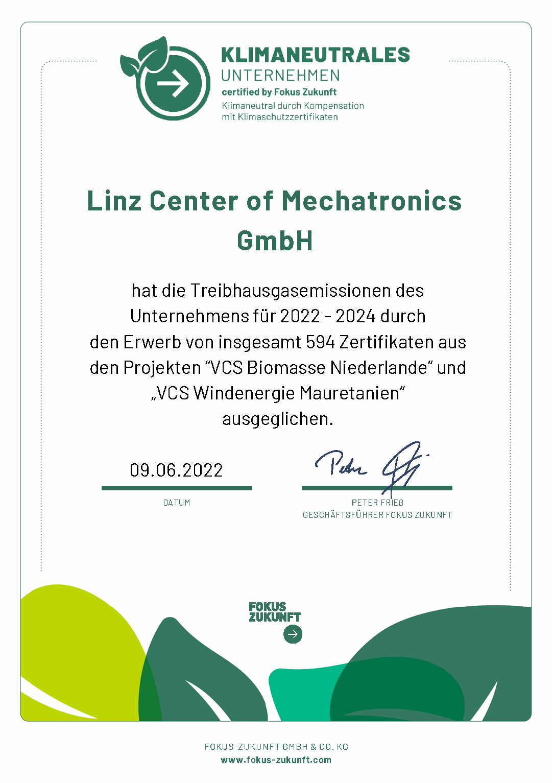 Aus diesem Grund haben wir die Treibhausgasemissionen, die durch die Tätigkeiten unseres Unternehmens verursacht werden, erfassen lassen und durch den Erwerb von insgesamt 594 Klimaschutzzertifikaten für die Jahre 2022 und 2024 ausgeglichen. Mit diesen Zertifikaten unterstützen wir ein Windkraft Projekt in Mauretanien, sowie ein Biomasseprojekt in Holland durch den VCS Standard zertifiziert wurde.