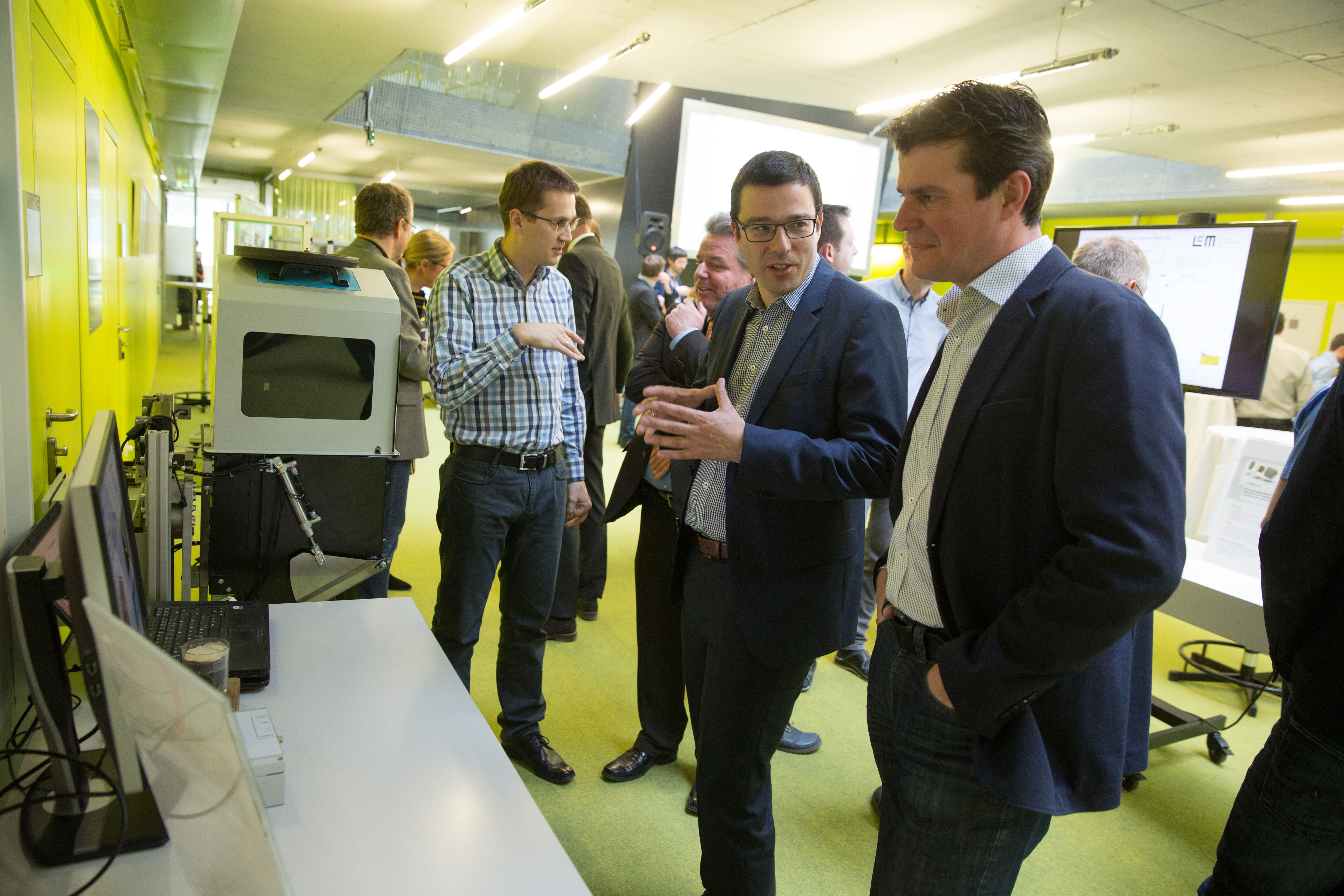 Während eines Rundgangs durch die verschiedenen Forschungsbereiche des LCM erlebten die Besucher der Hausmesse die einzelnen Kompetenzfelder hautnah. Experten für virtuelle Modelle und Adaptronik sowie Fachleute für smarte Automation und intelligente Materialien standen den geladenen Gästen Rede und Antwort – und konkretisierten sofort die daraus entstehenden, wirtschaftlichen Potenziale.