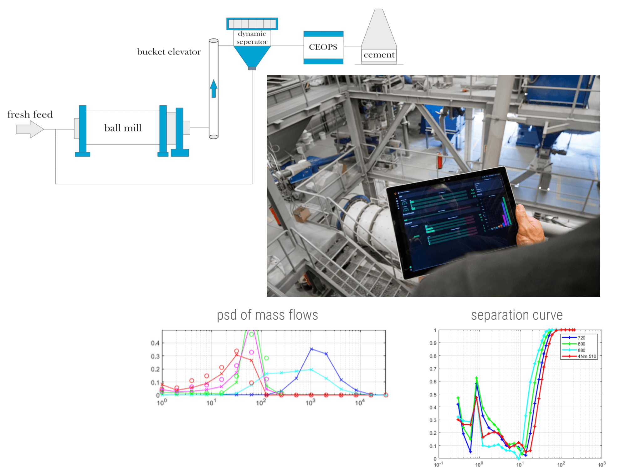 Im Projekt mit der Firma Cemtec wurde ein Modell für einen Mahlprozess bestehend aus Mühle und Sichter erstellt. Die Identifikation der Modellparameter erfolgte mit Anlagen und Labordaten. Das Prozessmodell ermöglicht eine Schätzung der Materialfeinheit mittels Partikelgrößensverteilungen an unterschiedlichen Stellen im Prozess und gibt Einblick in die Dynamik bei Produktwechselvorgängen. In Form einer Functional Mockup Unit (FMU) ist das Modell auch auf dem Prozessrechner ausführbar und somit als virtueller Sensor (Softsensor) im Betrieb einsetzbar.