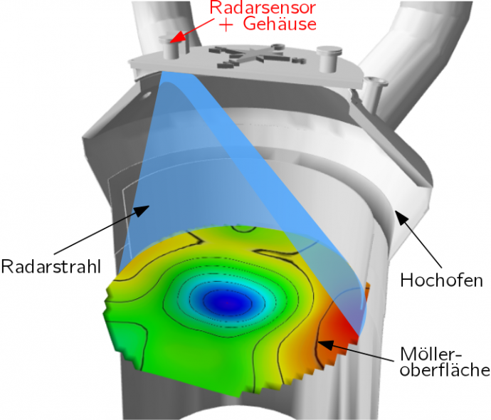 Eine kontinuierliche Beobachtung der Mölleroberfläche im laufenden Hochofenbetrieb ermöglicht eine optimierte Hochofenbefüllung und somit einen effizienteren Hochofenprozess. Daraus resultieren niedrigere Energie- und Rohstoffkosten. Bisher verwendete Messprinzipien beruhen auf punktweisen Messungen der Oberfläche, z.B. Füllstandssensoren, bzw. mechanischen Systemen zum Abscannen der Oberfläche. Die rauen Umgebungsbedingungen im laufenden Hochofen, Staub, Hitze, etc. machen auch die Verwendung von herkömmlichen optischen und akustischen Messsystemen unmöglich.