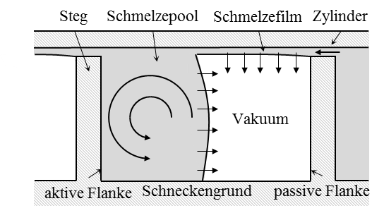 Der Stofftransport in hochviskosen Polymeren ist bei geringen Konzentrationen an flüchtigen Bestandteilen hauptsächlich durch Diffusionsvorgänge bestimmt. Aus verfahrenstechnischer Sicht wird der Entgasungsvorgang im Extruder durch zwei parallele Mechanismen kontrolliert: (1) Entgasung vom rotierenden Schmelzepool an der aktiven Schneckenflanke und (2) Entgasung vom Schmelzfilm an der Zylinderoberfläche.