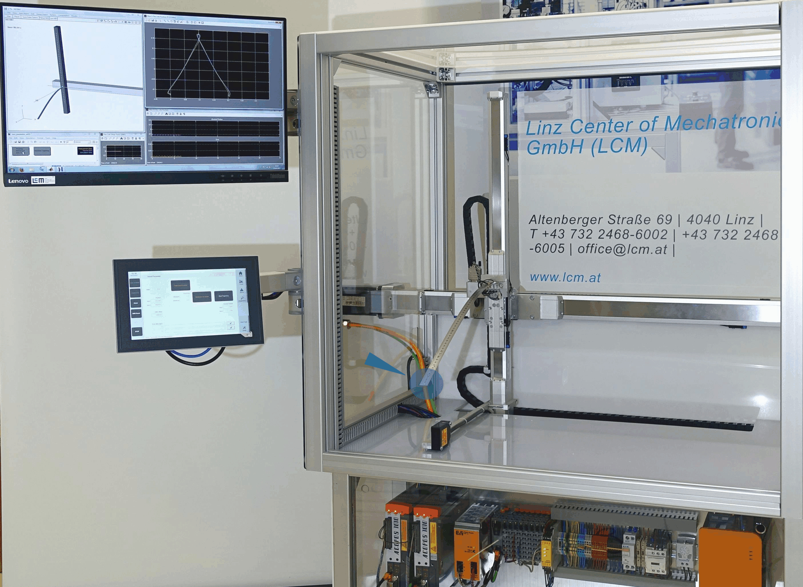Handhabungssysteme müssen möglichst schnell vom Ausgangsort zum Zielort verfahren. Der Einsatz von Leichtbaukonzepten hilft Systemen schneller zu werden, da die Reduktion der bewegten Masse auch den Energiebedarf für Beschleunigung und Abbremsung der Masse reduziert. Oft steigt durch die Gewichtsreduktion der Konstruktion auch deren Schwingungsneigung. Der LCM Demonstrator präsentiert anhand des Beispiels eines hoch schwingungsfähigen Systems wie flexible Strukturen exakt bewegt werden können.