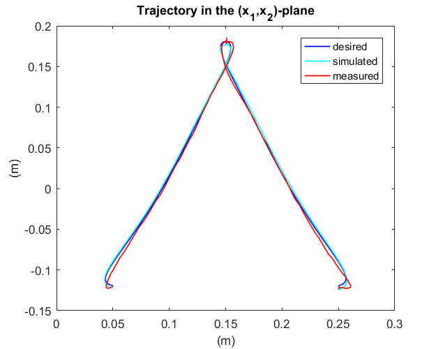 Wie im Video präsentiert, erlaubt das vorgestellte Regelungskonzept die präzise Realisierung hochdynamischer Punkt-zu-Punkt Bewegungen. Ein Vergleich von vorgegebenen Bahn und gemessener Bahn ist in Abbildung 2 dargestellt. Neben der ausgezeichneten Genauigkeit, kann durch die nahezu schwingungsfreie Bewegung die Verfahrgeschwindigkeit zusätzlich erhöht werden. Gegenüber einer konventionellen Regelung wird so die Punkt zu Punkt Übergangszeit um 32 % reduziert.