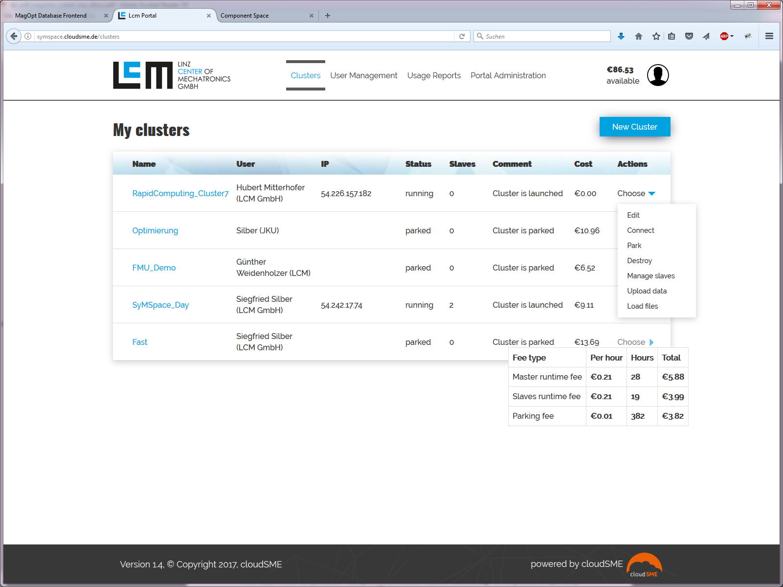 SyMSpace steht sowohl zur lokalen Installation als auch im LCM Cloudspace zur Verfügung – Für rechenintensive Optimierung oder einfach um jedes Mal mit einer sauberen, reproduzierbaren Arbeitsumgebung zu starten. Nach der Registrierung für das LCM Cloud Portal können Sie mit nur drei Klicks Ihren Cloud Cluster erstellen. Schon können Sie sich einloggen und in der vorinstallierten SyMSpace Umgebung losstarten. Ohne lokale Installation, ohne Hardwareinvestition, ohne Wartungsaufwände. Durch die kostengünstige pay-per-use Abrechnung bezahlen Sie für die Nutzungsdauer, übersichtlich gelistet auf einer einzigen Abrechnung für alle Kosten, von den benutzten Lizenzen zu den Cloudressourcen.